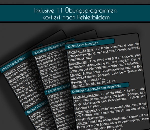 Mit diesem Set verbesserst du deinen Sitz, dein Takt- und Körpergefühl. Du findest Übungen, die dir helfen Sitzfehler zu korrigieren z.B. runde Schultern, nachvorne fallen, Bein hochziehen. Es gibt Übungen, die dein Leichttraben und Mitschwingen verbessern. Auch wenn du einen guten Grundsitz hast, verbesserst du mit diesen Übungen dein ganzes Reiten.