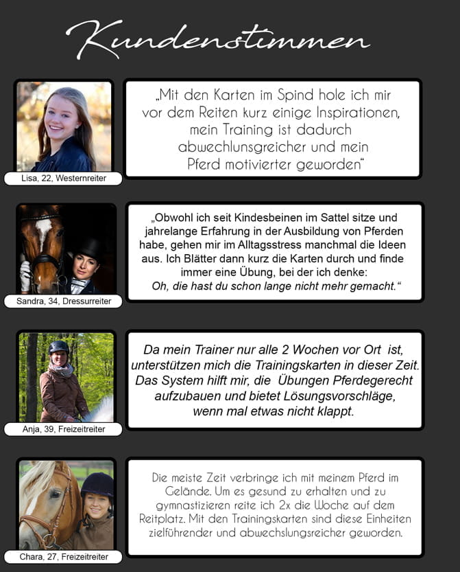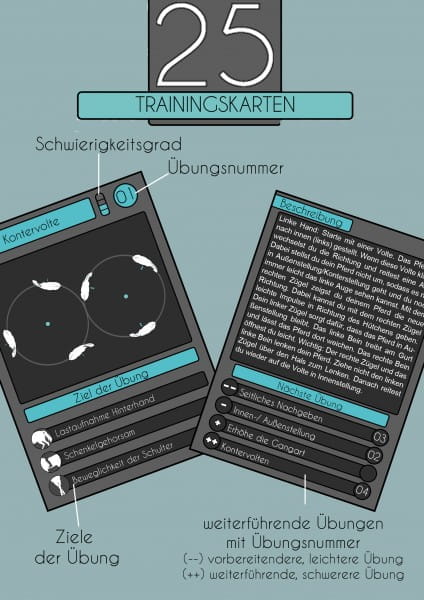 Speziell hierfür entwickelt wurden die 25 Trainingskarten Sets. Trainiere jetzt mit noch mehr Spaß und Abwechslung zwischen den Reitstunden mit den 25 Trainingskarten. Die Karten bieten dir neue Trainingsanreize und Ideen zur Gestaltung deines täglichen Trainings, Reitweisenübergreifend! Ob für die gelegentliche Platzeinheit zwischen langen Geländeritten oder für das regelmäßige Training, die 25 Trainingskarten leiten dich durch dein Training. Eine Übung klappt nicht? Kein Problem, auf der Rückseite findest du eine vorbereitende und leichtere Übung. Wenn du und dein Pferd die Übung schon könnt, findet ihr auf der Rückseite die weitergehende Übung. Dadurch arbeitest du dich mit deinem Pferden durch die Trainingskarten, dein Pferd setzt sich mehr auf die Hinterhand, die Schulter wird locker und die Karten führen dich bis zum fliegenden Galoppwechsel, Trabverstärkungen und Galopppirouetten. Dabei ersetzen sie natürlich keinen Trainer, aber helfen die eigenen Stunden abwechslungsreicher zu gestalten!