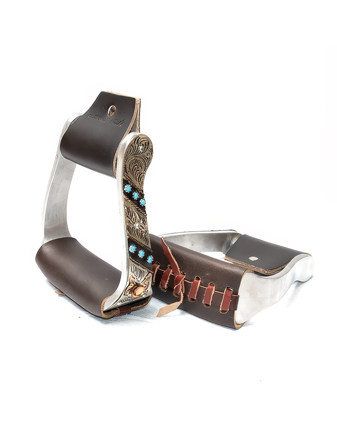 Diese stilvollen Steigbügel aus Aluminium vereinen Funktionalität mit einem besonders edlen Western-Look. Die aufwendig gearbeiteten Verzierungen mit floralen Mustern und türkisfarbenen Akzenten machen sie zu einem echten Blickfang am Sattel.