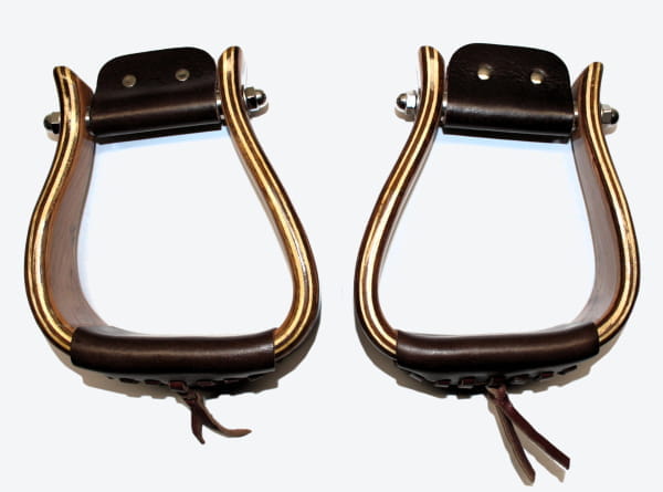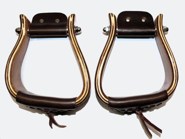 Die edle Holzmaserung und die dunklen Lederapplikationen machen diese Steigbügel nicht nur funktional, sondern auch optisch zu einem echten Hingucker am Sattel.