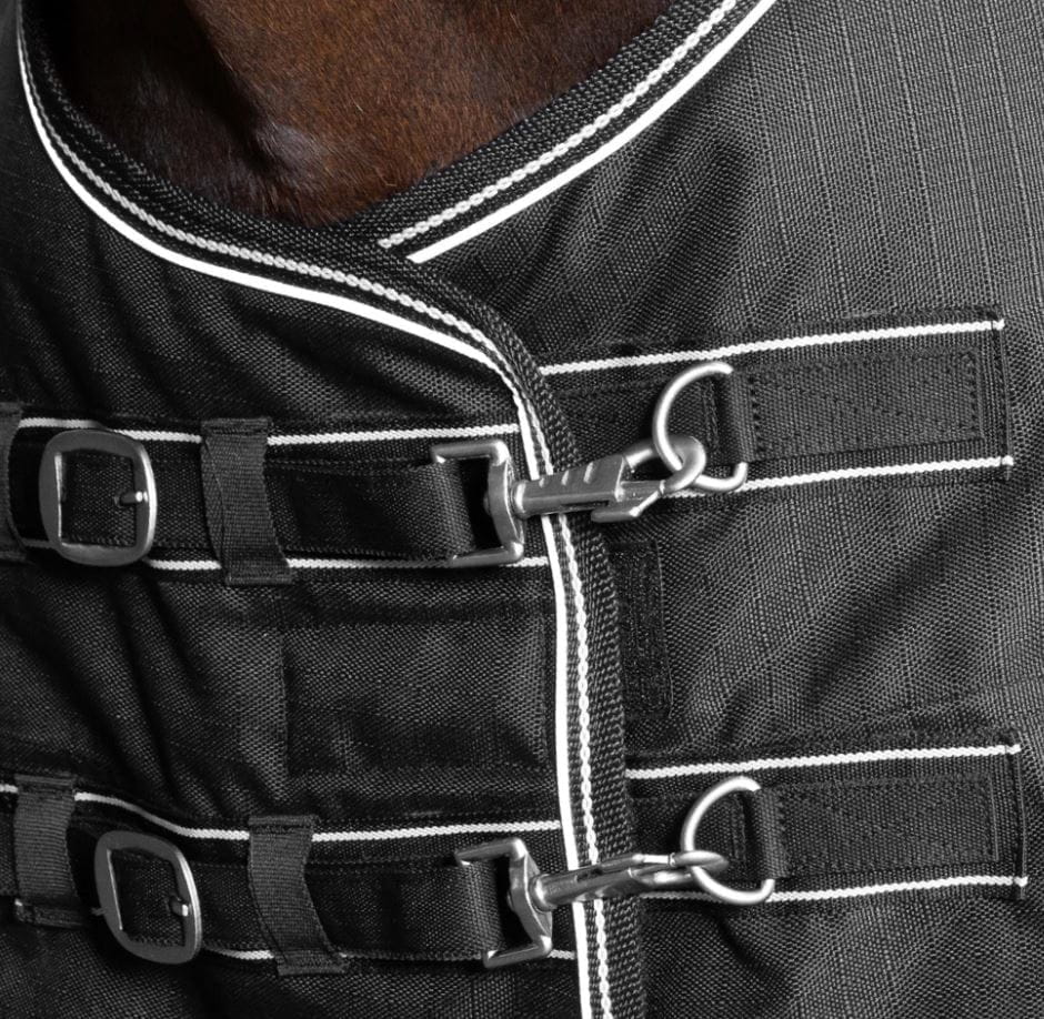 Die Decke verfügt über eine Vielzahl weiterer praktischer Features, darunter reflektierende Kordeln und Aufschriften, die die Sichtbarkeit Ihres Pferdes bei schlechten Lichtverhältnissen verbessern. Der doppelt verstellbare Frontverschluss mit Karabinerhaken und D-Ringen sorgt für eine sichere Passform. Kreuzgurte und ein einfach zu säubernder Schweifriemen sind weitere nützliche Details.