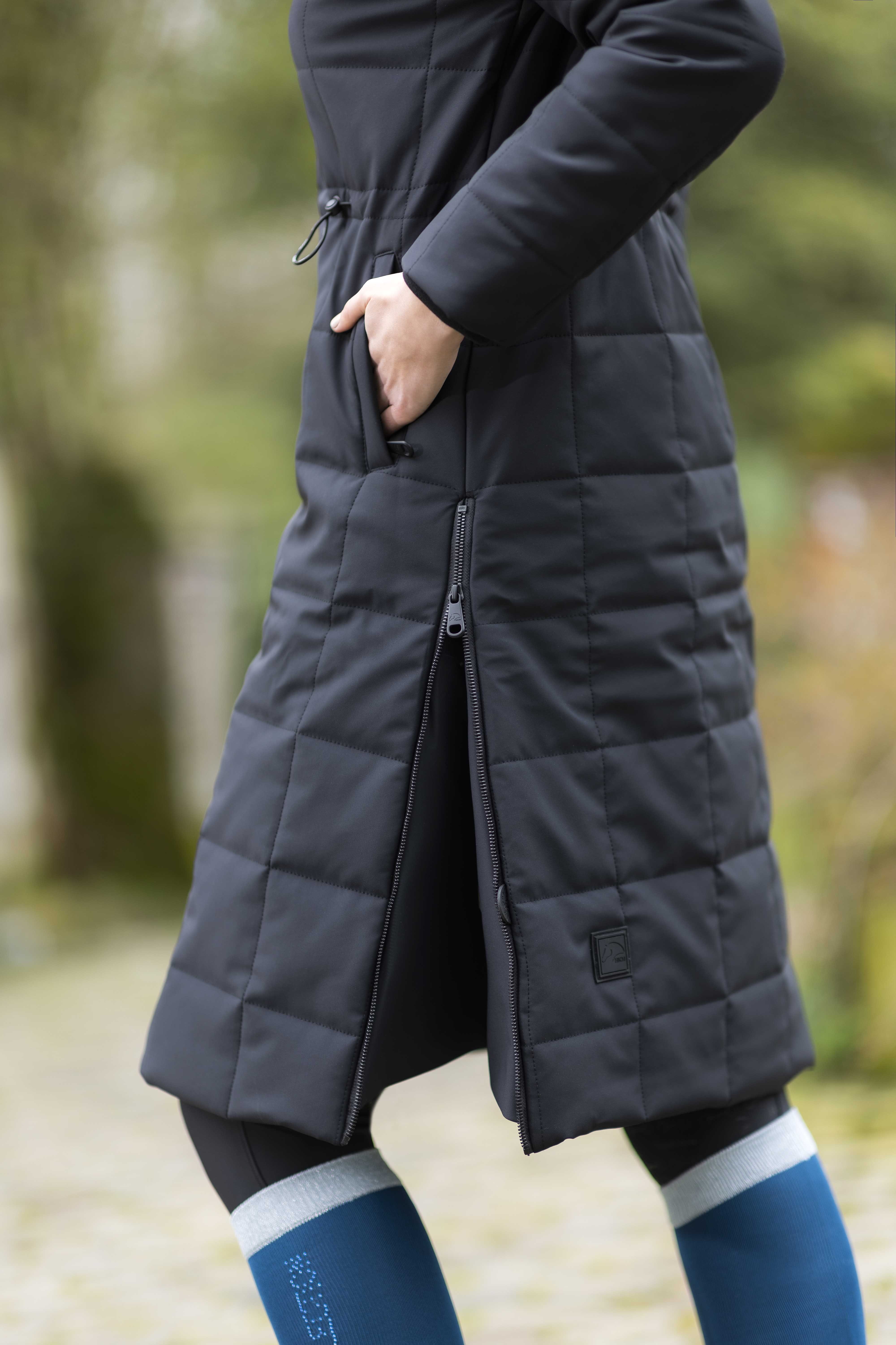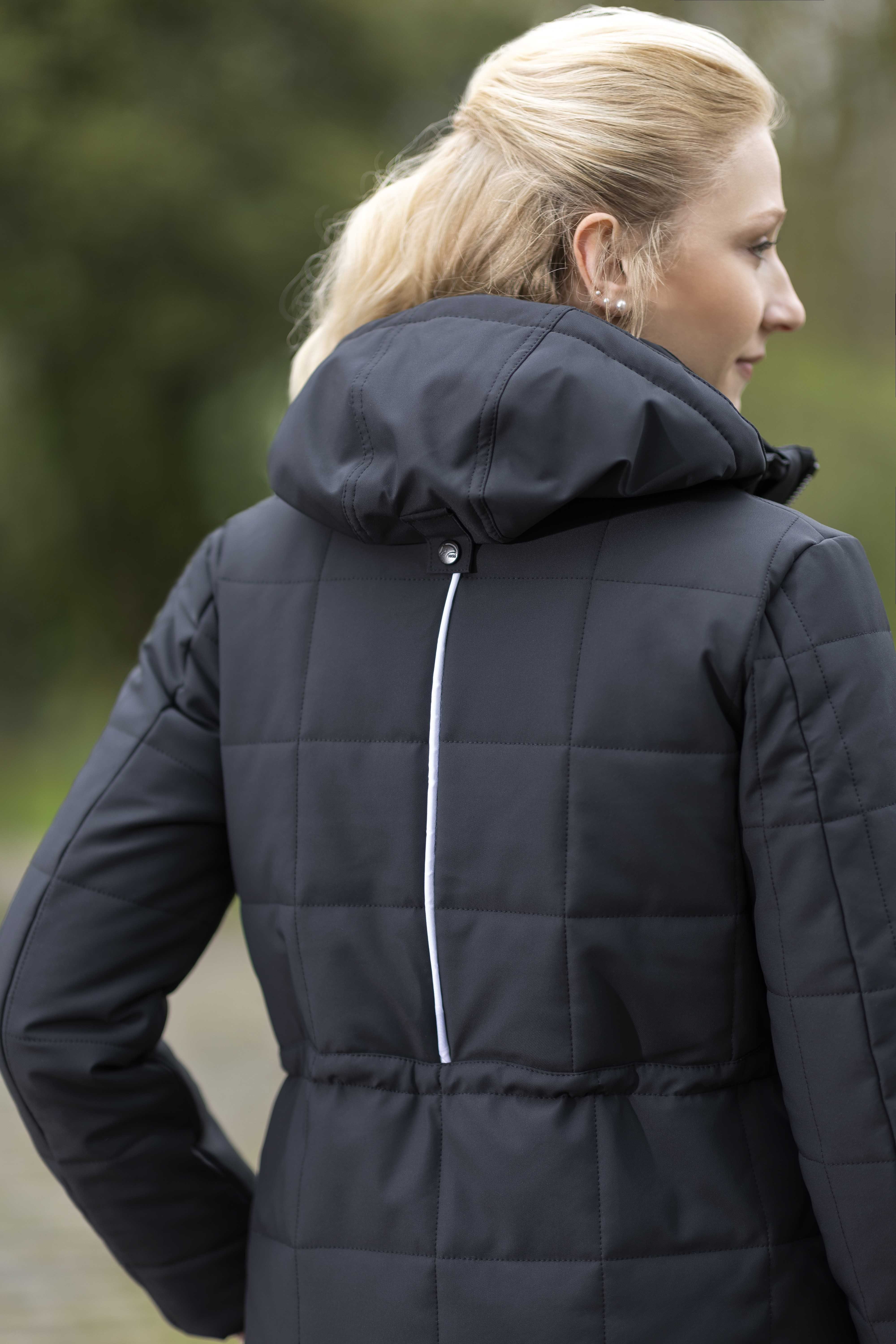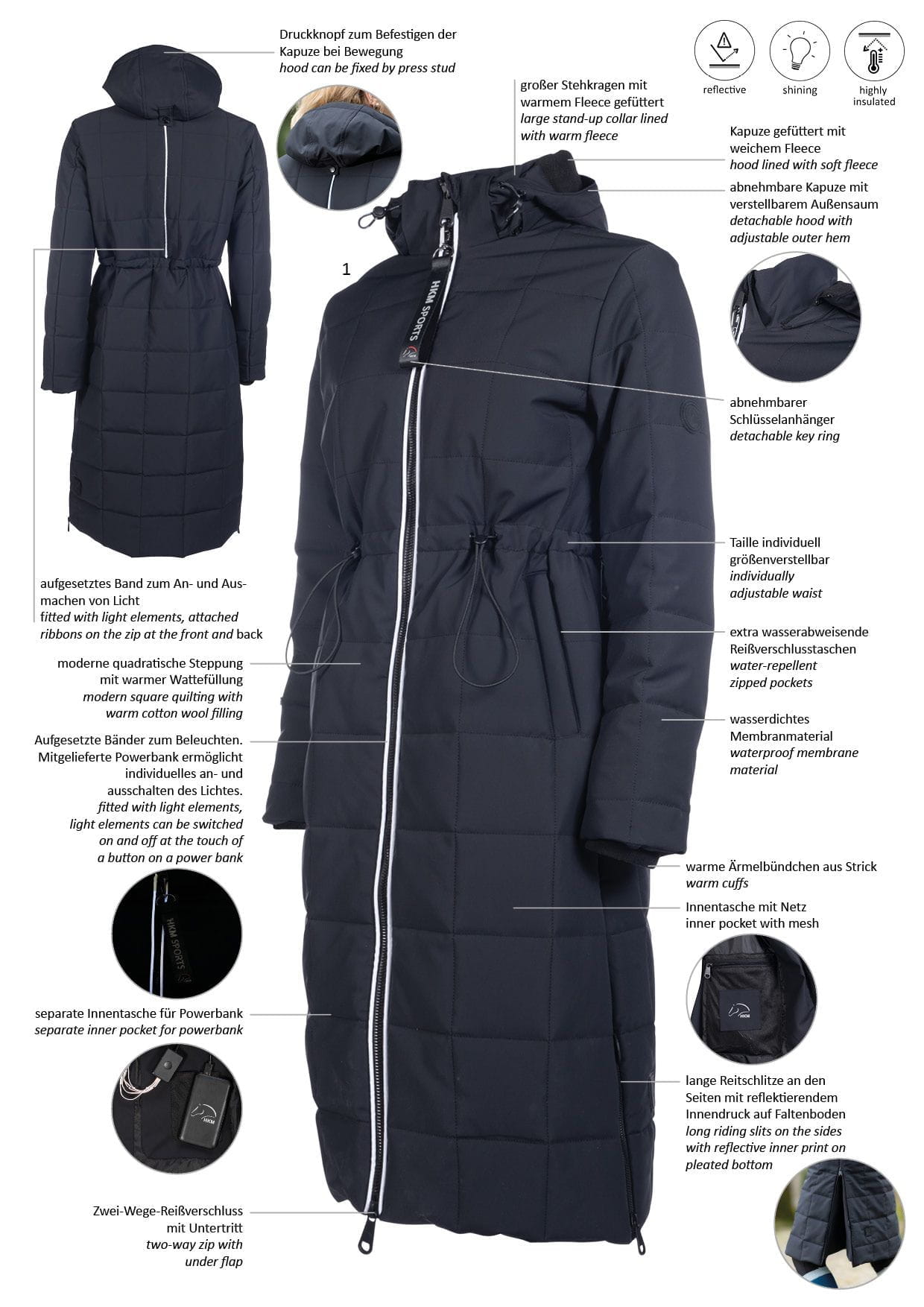Der Mantel Honey ist der erste Mantel von HKM, der mit einer aktiven Beleuchtung ausgestattet ist. Er ist in moderner quadratischer Steppung mit warmer Wattefüllung designt, dabei aus wasserdichter Membran gefertigt und besonders lang geschnitten. Die Passform des langen Reitmantels lässt sich über einen Gummizug auf Taillenhöhe individuell regulieren und lange Reitschlitze sorgen dafür, dass der Mantel auch auf dem Pferd getragen werden kann. Ausgestattet mit Lichtelementen ist der Mantel die perfekte Wahl für Reiterinnen, die höchsten Wert auf Funktionalität, Sicherheit und Stil im Reitalltag legen, denn er vereint innovative Technologie mit modernem Design. Die aufgesetzten Bänder mit Lichtelementen am Reißverschluss vorne und am Rücken sorgen für eine verbesserte Sichtbarkeit, insbesondere bei schlechten Lichtverhältnissen sowie in der Dunkelheit. Mit nur einem Knopfdruck an der mitgelieferten Powerbank kann die aktive Beleuchtung der Jacke ein- und ausgeschaltet werden. Die Powerbank findet ihren Platz in einer Innentasche der Jacke und sorgt für eine Beleuchtungsdauer von bis zu 4 Stunden. Für zusätzliche Sicherheit im Dunkeln sorgt ein reflektierender Druck, der sich auf den Faltenboden der langen Reitschlitze befindet. Der große Stehkragen des Mantels ist mit warmem Fleece gefüttert, um vor Kälte zu schützen. Außerdem verfügt der Mantel über eine abnehmbare Kapuze, die ebenfalls über eine Fleecefütterung verfügt. Neben der Innentasche für die Powerbank ist der Mantel Honey mit einer weiteren Innentasche mit Netz ausgestattet. Weiterer Stauraum befindet sich in den zwei Reißverschluss-Außentaschen. Elastische Ärmelbündchen sorgen für eine hohe Wärmehaltung. Ein abnehmbarer HKM-Schlüsselanhänger rundet das Design ab.