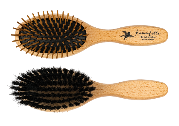 Die glattpolierten Buchenholzstifte der KämmLotte gleiten sanft durch Mähne & Schweif, ohne Haare auszureißen. Die dicht gesetzten Rosshaare entfernen am Kopf jedes Staubkorn und zaubern ein perfekt glänzendes Finish. Für Mähne, Schweif und Kopf.