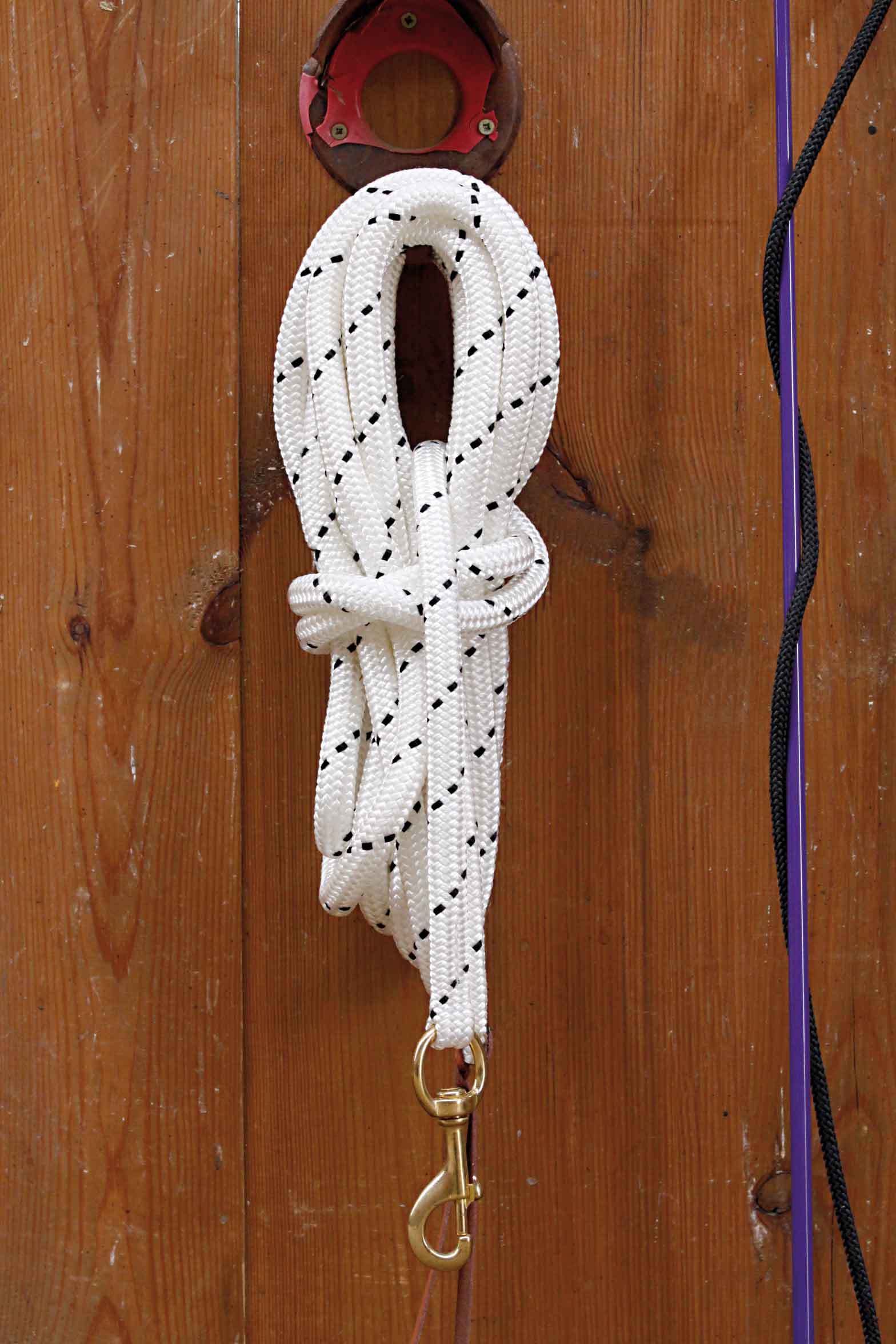 Das Rope sollte deine Hilfengebung präzise weiterleiten und auf das Knotenhalfter übertragen. Die meisten guten Bodenarbeitsseile haben innen eine sogenannte Seele, die dem Seil seine Stabilität verleiht. Eine gewisse Dicke des Seils von ca. 1,3cm ist von Vorteil, damit es gut in der Hand liegt. Zu dick sollte es allerdings auch nicht sein, da es sonst unhandlich wird.
