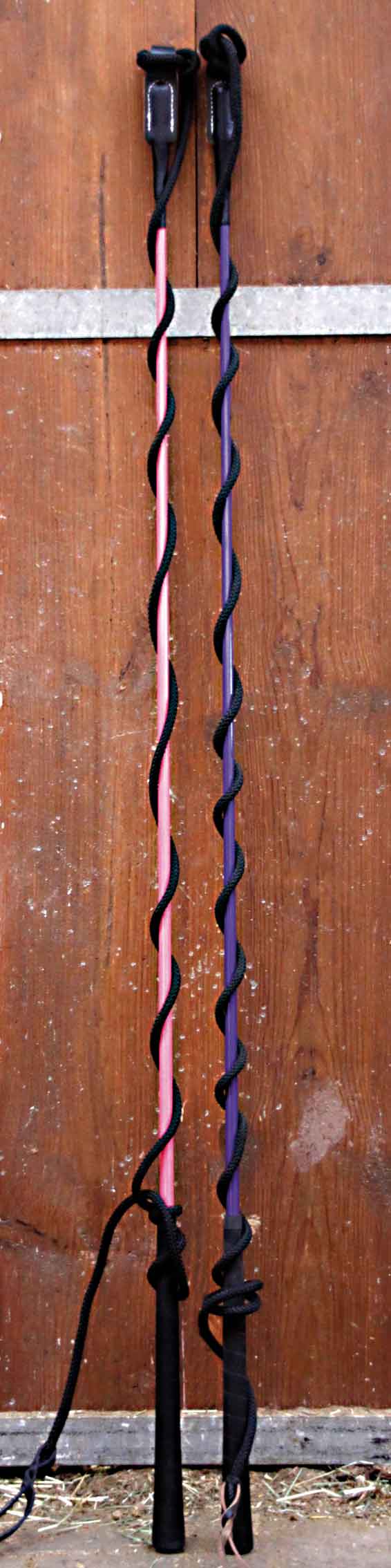 Als treibende Hilfe bei der Longenarbeit dient die Longierpeitsche. Longierst du links herum, hast du die Longe in der linken Hand und die Peitsche in der rechten Hand. Wie auch bei dem Carrot Stick solltest du darauf achten, dass die Longierpeitsche nicht zu schwer ist und ausbalanciert in deiner Hand liegt. Optimaler Weise hat sie auch einen angenehmen Griff, der das Ganze abrundet. Die Länge der Peitsche sollte je nach dem auf welcher Zirkelgröße du longierst gewählt werden. Es gibt Peitschen bis ca. 2 m Länge, aber auch welche, die ca. 3 bis 4m betragen. Der Peitschenschlag sollte eine Länge von ca. 4 bis 5m haben. Steckpeitschen oder auch Teleskoppeitschen sind besonders praktisch, da sie sich in der Länge anpassen lassen und platzsparend weggeräumt werden können.