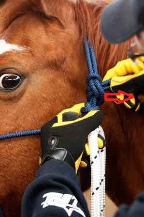 Beim Knoten des Halfters ist darauf zu achten, dass das Seilende vom Pferdeauge weg zeigt. Das Seilende wird von oben von hinten durch die Schlaufe durchgefädelt. Nun kann das Knotenhalfter in die richtige Position gerückt werden. Anschließend wird das Seilende hinter dem Kontenhalfter an der Schlaufe durch gefädelt und zum Verknoten durch die entstandene Schlaufe durchgeführt und festgezogen.