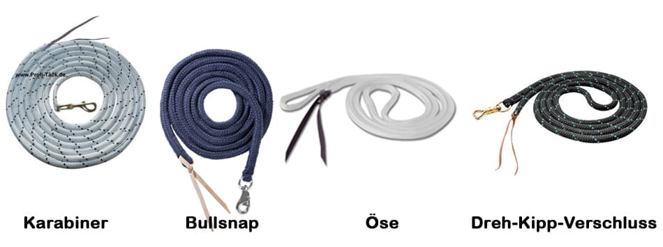 Auch beim Verschluss des Seiles am Knotenhalfter gibt es Unterschiede. Du kannst das Seil mit einem Metallverschluss, wie einem Karabiner, Dreh-Kipp-Verschluss, Bullsnap oder mit einer Öse (einfache Schlaufe am Ende des Seils) am Knotenhalfter befestigen. Der häufigste Verschluss sind ein Dreh-Kipp-Verschluss, ein Bullsnap oder eine Öse. Besonders ein Dreh-Kipp-Verschluss wird gerne genommen, da er sich bei Zug auf dem Seil nicht so leicht öffnet, aber im Panikfall dennoch schnell gelöst werden kann. Hinzu kommt das höhere Gewicht des Verschlusses. Hierdurch werden die Anweisungen vom Seil noch stärker auf das Knotenhalfter übertragen. Bodenarbeitsanfänger nutzen gerne einen schwereren Metallverschluss. Wenn du Fortgeschrittener bist, kannst du auch gut mit einer Öse arbeiten, die eine feinere Kommunikation ermöglicht.