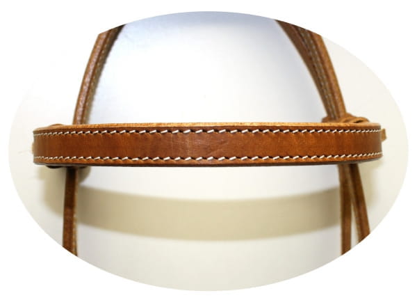 Schlichtes Harness Browband Kopfstück mit Easy Change Gebissverschnallung, kein lästiges Bändchen wechsel oder Chicagoschrauben verlieren. Dieses Westernkopfstück hat außerdem eine weiße Ziernaht die die Optik dieses Kopfstücks abrundet. Der Stirnriemen dieser Trense hat eine Länge von ca 41cm (außen gemessen).