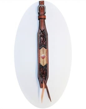 Ein tolles Stirnband-Westernkopfstück mit 2 verschiedenen Lederfarben, die prima harmonieren. Abgerundet wird der Look dieses Browband Westernkopfstücks mit einem tollen Arrow Muster aus Rawhide an den Backenstücken und dem Stirnriemen. Der Gebissverschluss erfolgt über ein Lederbändchen, ganz ohne Chicagoschrauben.
