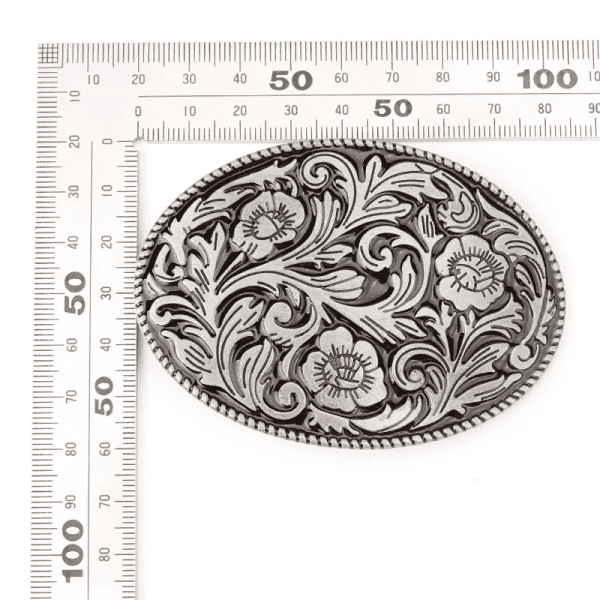 Schickes Buckle mit schönen floralen Ornamenten in silber und geschwärztem Hintergrund. Die Gürtelschnalle lässt sich an Gürtel mit einer Breite bis zu 4 cm befestigen. Die Schnalle ist vollverzinkt.