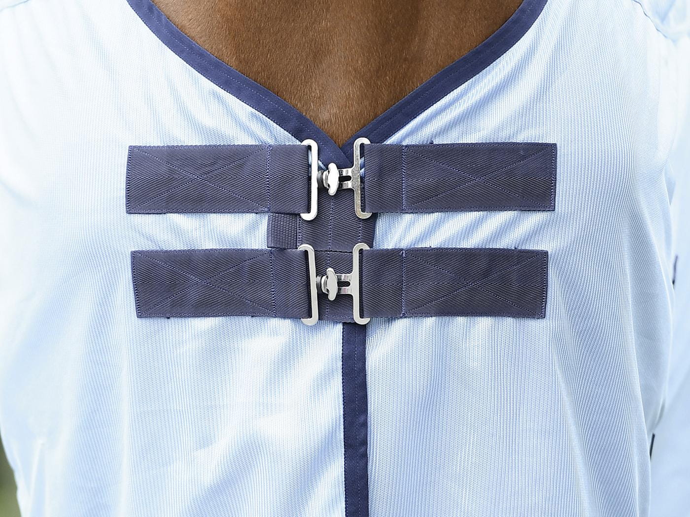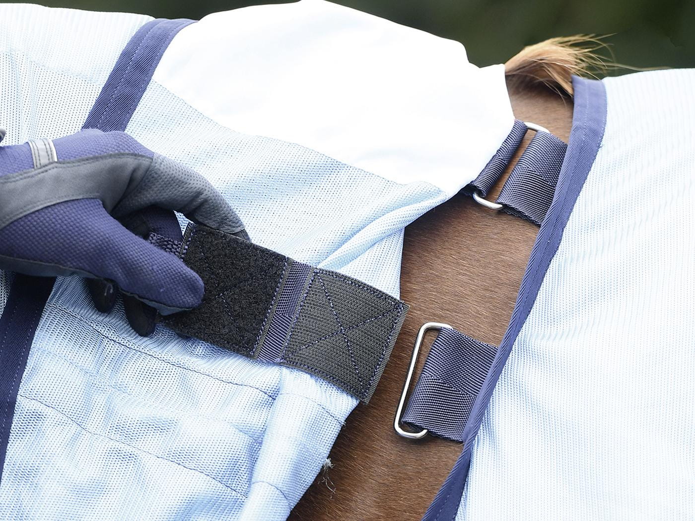 Das Halsteil wird mit 3 Klett- und Schnallenverschlüssen an der Decke befestigt. Es gibt mehr Ösen zu Auswahl, so dass Sie die Möglichkeit haben, das Halsteil so zu fixieren, wie es am besten zu Ihrem Pferd passt.  Das Halsteil ist im Bereich der Mähne mit Nylon unterlegt und rutscht sich immer wieder in die richtige Position, ohne das die Mähne angegriffen wird.