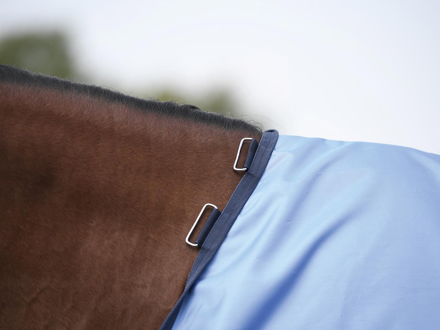 Das Halsteil wird mit 3 Klett- und Schnallenverschlüssen an der Decke befestigt. Es gibt mehr Ösen zu Auswahl, so dass Sie die Möglichkeit haben, das Halsteil so zu fixieren, wie es am besten zu Ihrem Pferd passt. Das Halsteil ist im Bereich der Mähne mit Nylon unterlegt und rutscht sich immer wieder in die richtige Position, ohne das die Mähne angegriffen wird.Die Decke kann auch ohne Halsteil genutzt werden.