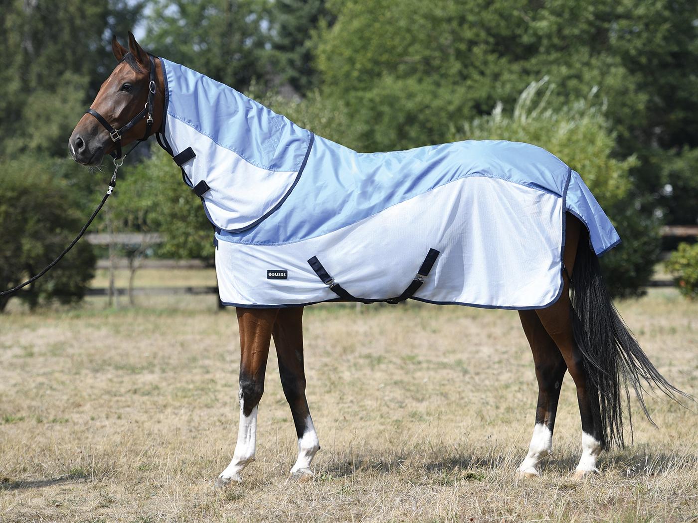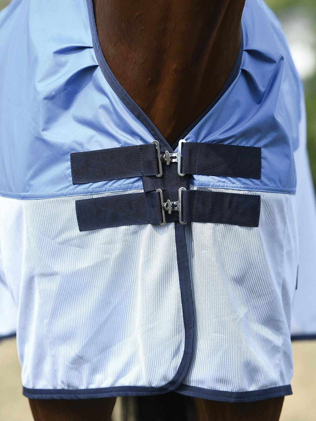 Funktionskombination von Fliegen- und Abschwitzdecke zur Nutzung an warmen Tagen. Abschwitzfunktion am Rücken und gleichzeitig Fliegenschutz an der Seite.