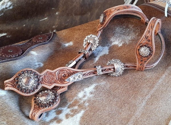 Wunderschönes Zweiohrkopstück von Cattleman´s. Dieses Showkopfstück hat eine schicke Flower Punzierung und Antique Conchos mit peachefarbenen Rhinestones - es ist einfach ein absoluter Hingucker. In der mittleren Einstellung hat es von einer Gebisseinschnallung zur anderen ca 96cm.
