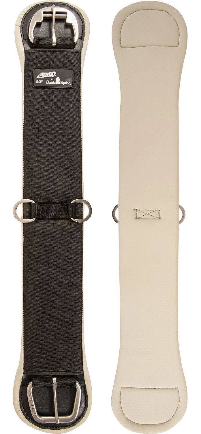 Der neue Aura von Classic Equine besteht aus einem dreischichtigem Gewebe, welches 100% atmungsaktiv ist und eine gute Passform bietet. Der Sattelgurt ist schwarz und auf der Unterseite aus weichem Jersey Material, welches sehr hautfreundlich ist. Der atmungsaktive und geruchsbindende Kern dieses Neoprengurtes ist zusätzlich stoßabsorbierend. Die Außenhülle des Aura ist aus reiß- und abriebfestem Material.