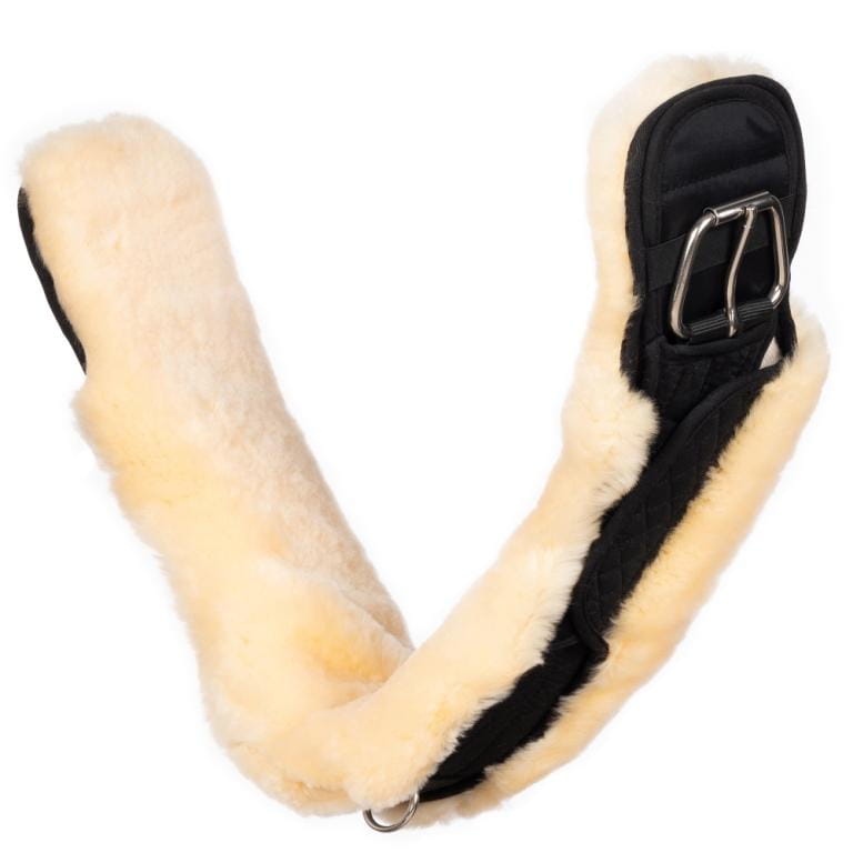 Dieser Lammfellsattelgurt aus der PT-Lammfell Line ist aus 100% Lammfell und hat die beliebte Mondform. Der schwarze Steppstoff ist aus strapazierfähiger Baumwolle und die Wollhöhe beträgt ca. 30 mm. Der Gurt verfügt über zwei Edelstahlschnallen mit Schnellgurtung (Vorsicht beim Gurte!). Außerdem sind die Sattelgurte mit einem D- Ringen zum befestigen von Hilfszügeln, Vorderzeug oder Backcinch ausgestattet. Für einen optimalen Sitz haben die Lammfellwesterngurte der PT-Lammfell Line eine Führung aus Nylongurtmaterial für das Off Billet und den Tie Strap. Das Lammfell dieses PT-Lammfell Linie Mondgurtes ist mittels Klettverschluss abnehmbar.