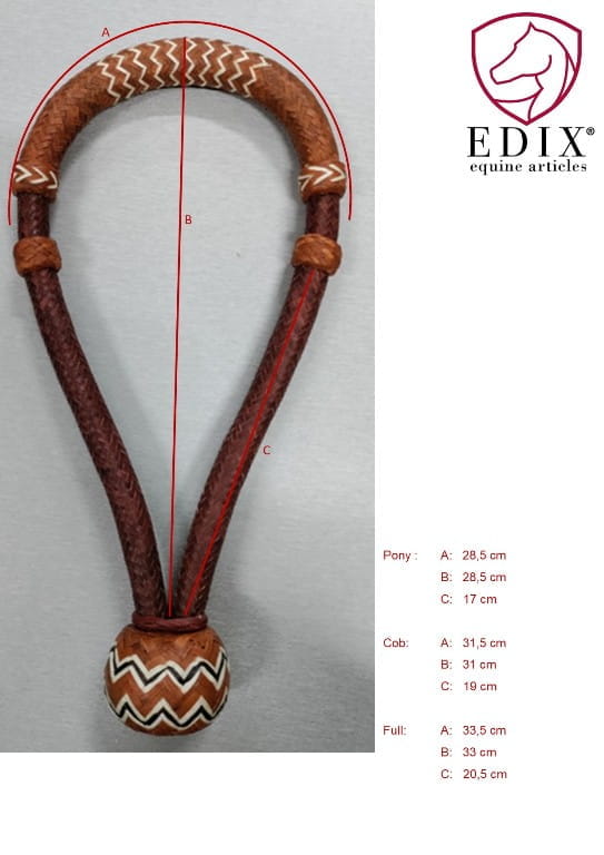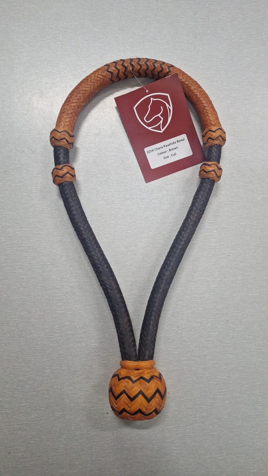 Das Bosal Chara von Edix ist aus echtem Rohleder auf einem Rohlederkern gefertigt. Der Nasenteil ist mit 32 Strängen geflochten und für den Rest des Bosal werden 28 Saiten verwendet. Dadurch wird die Nasenpartie weicher. Aus der altkalifornischen Reitweise kommt diese gebisslose Zäumung mit Bosal und Mecate. Die Bosal sind üblicherweise aus Rohhaut gefertigt.