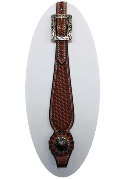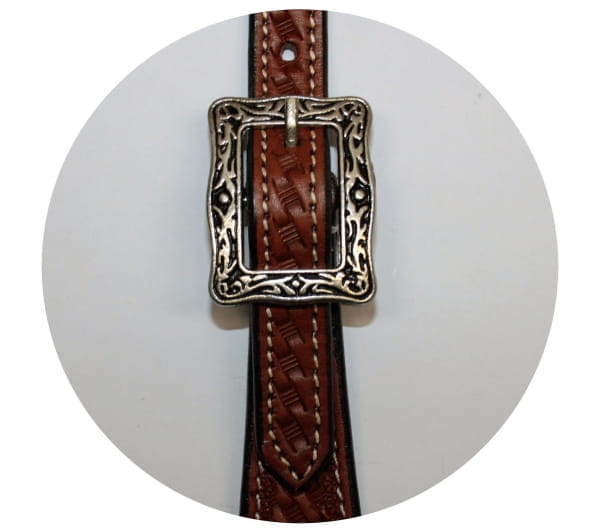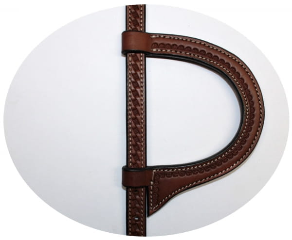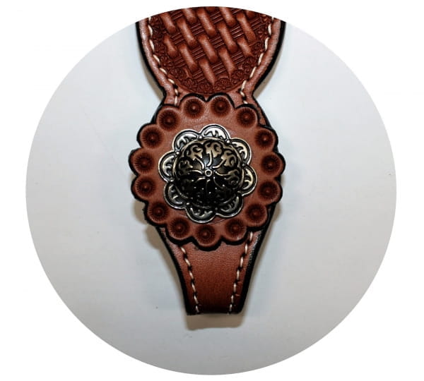 Kopfstück, gefertigt aus Leder in der Farbe medium. Dieses Einohr-Kopfstück eignet sich aufgrund seiner hübschen Schnallen und Conchos sehr gut als Showkopfstück. Sehr ansprechnd ist auch die Punzierung dieses Westernkopfstücks. Insgesamt ein wirklich richtig gutes Preis- Leistungsverhältnis. Wie immer passen unsere Kopfstücke allen im Westerntyp stehenden Pferden.