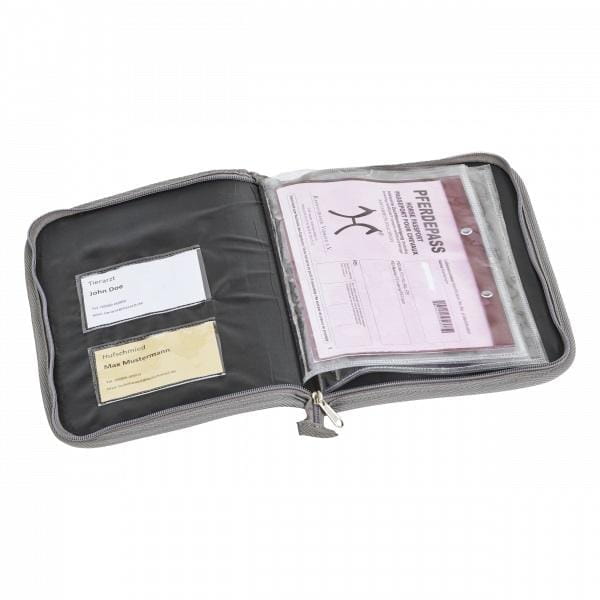 Praktische Mappe zur Aufbewahrung und Mitnahme von Equidenpässen und ähnlichen Dokumenten. Die Mappe hat zwei Einschubfächer für Visitenkarten und vier Klarsichthüllen für Equidenpässe etc. Sie lässt sich sicher mit einem Reißverschluss verschließen.