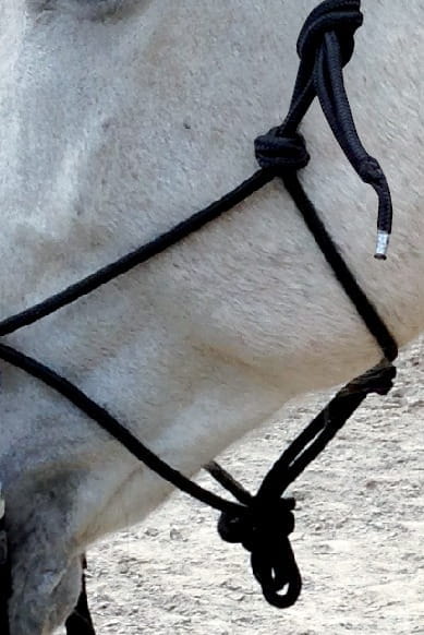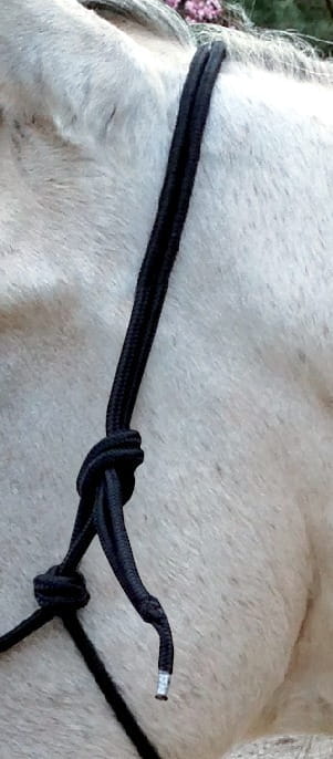 Geknotetes Kordelhalfter aus Polypropylen. Zügelbefestigung durch 2 Edelstahl-Schnallen auf dem Nasenriemen. Geliefert mit einem Paar Zügel, durch mexikanische, verchromte Zinkkarabinerhaken leicht abnehmbar. Gesamtlänge 3 Meter.