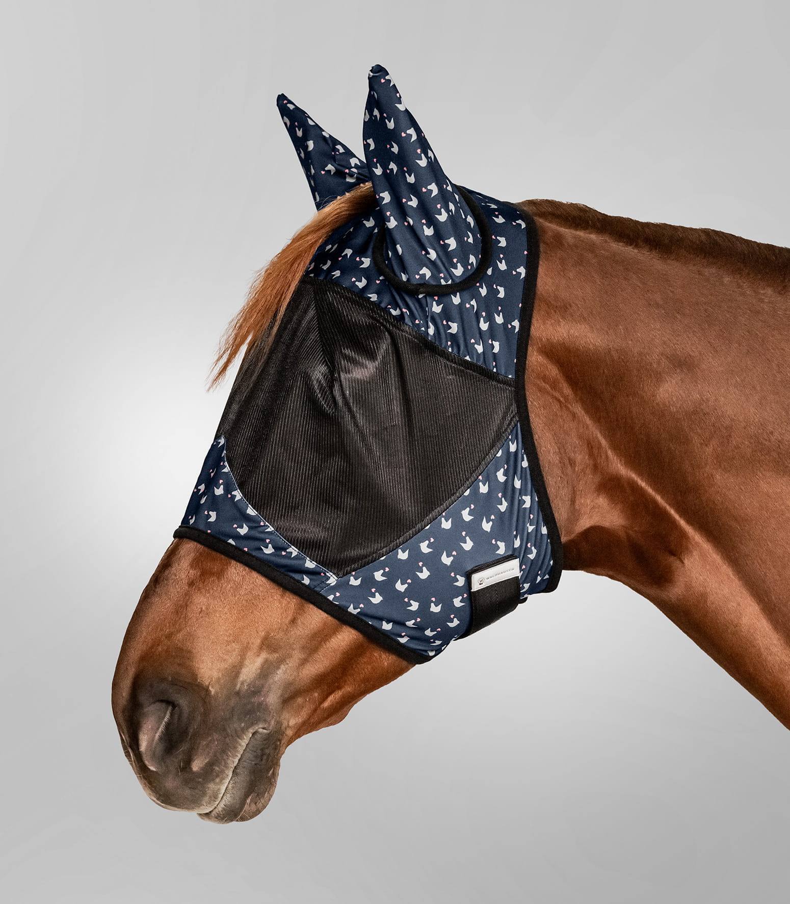 Fliegenmaske mit fixiertem Nüsternschutz und Augenschutz aus engmaschigem Netzgewebe mit Spielraum für die Wimpern.