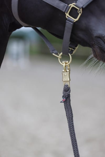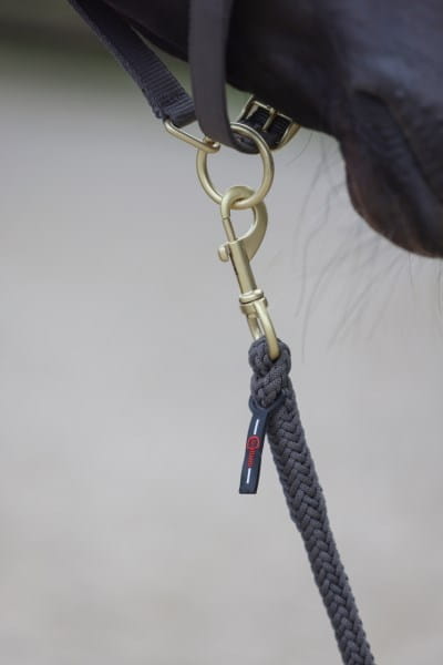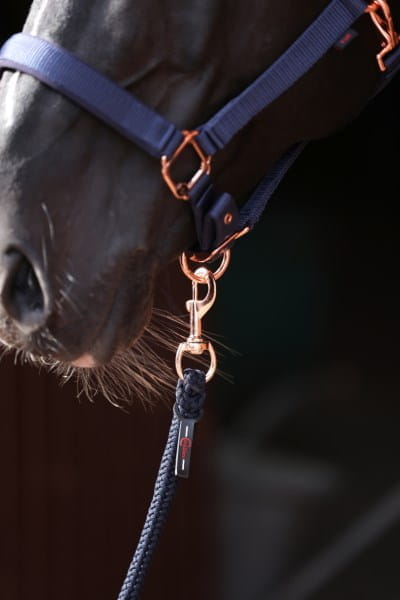 Der Anbindestrick Luxus ist ein starker und dicker Führstrick aus Synthetik. Der Anbindestrick ist aus einem glatten Seil geflochten. Der Führstrick verfügt über einen hochwertigen, starken und silberfarbenen Karabinerhaken. Der Strick ist mit Metallbeschlägen und QHP-Gravur veredelt. Den ca. 2m langen Strick gibt es in verschiedenen Farben.