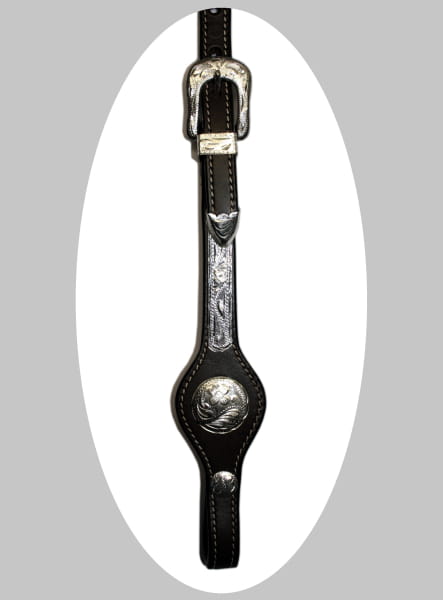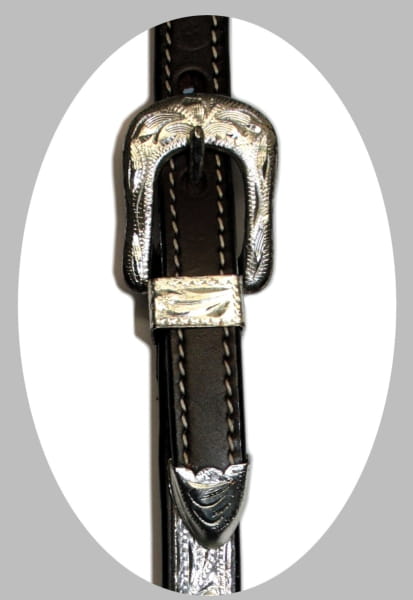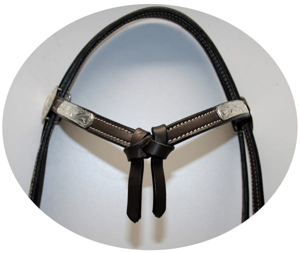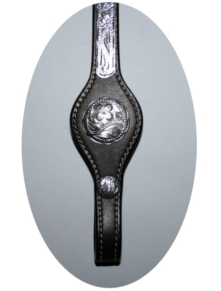 Optisches Highlight sind die aufwendig verzierten silberfarbenen Conchos und Schnallen mit floralen Gravuren, die dem Kopfstück einen edlen, traditionellen Western-Look verleihen. Die hellen Kontrastnähte unterstreichen die hochwertige Verarbeitung und setzen zusätzliche Akzente.