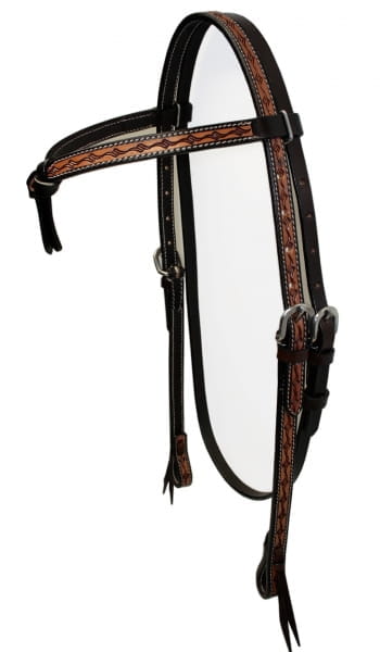 Zweifarbiges Futurity Kopfstück mit Barbwire Punzierung an Stirnriemen und Backenstücken. Der Gebissverschluss erfolgt über Lederbändchen. Der Stirnriemen dieser Trense hat eine Länge von ca 43cm (außen gemessen). Der Kehlriemen bei diesem Kopfstück ist dunkel.