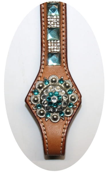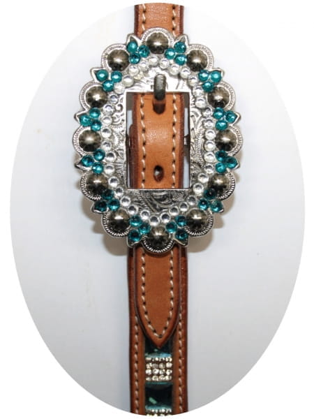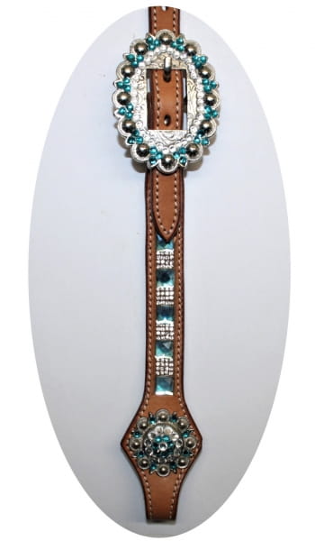 Tolles Showkopfstück aus hellem Leder mit weißen und türkisen Steinchen. Die Schnallen sind silber und ebenfalls mit Steinchen besetzt, wodurch das Kopfstück seine auffallend schöne Optik erhält. Die Schnallen lassen sich leicht mit Chicagoschrauben tauschen und die Gebisseinschnallung erfolgt ebenfalls über den Chicagoschrauben Verschluss. In der mittleren Einstellung hat das Kopfstück ca. 99cm. Passend für alle im Westerntyp stehenden Pferde. ACHTUNG: Die Chicagoschrauben regelmäßig nachziehen oder mit Nagellack/Sekundenkleber fixieren. Ein verlorener Concho oder eine verlorene Schraube sind keine Reklamation.