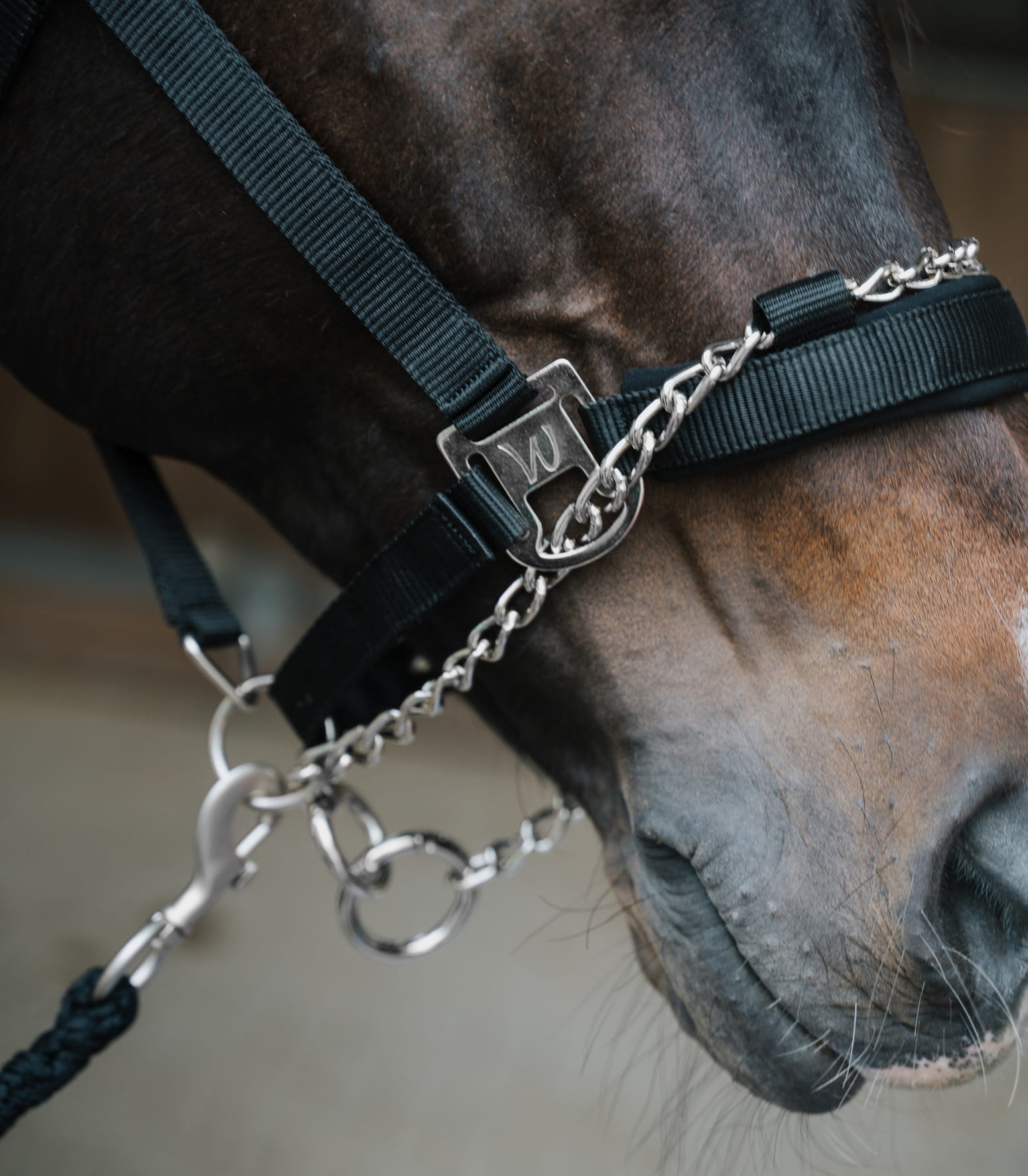 Hochwertiges Halfter mit integrierter Kette am Nasenriemen.
