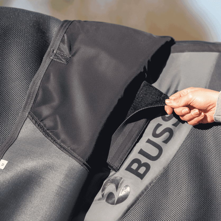 abnehmbare, längeneinstellbare Elastikgurte auf beiden Seiten können mit oben gelisteten Bewegungsdecken verbunden werden, um ein Hochklappen des Halsteils im hinteren Bereich bei Wind oder in der Bewegung zu verhindern