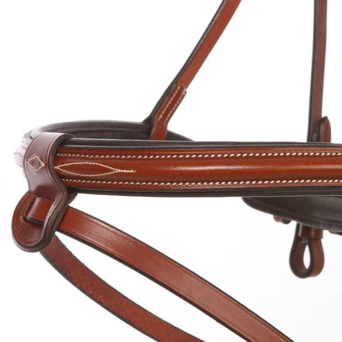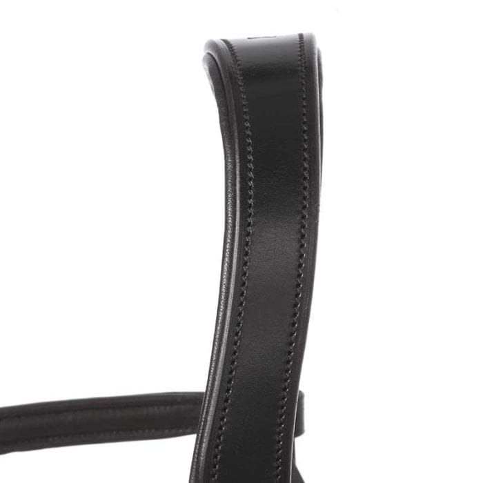 Die Huntertrense Lorenz besteht aus erstklassig deutschem Leder und ist somit sehr geschmeidig und anschmiegsam. Das Genickstück ist breit geschnitten, stark anatomisch geformt und sehr weich gepolstert. Der Kehlriemen ist, für eine bessere Positionierung, schräg angesetzt. Der Sperrriemen ist abnehmbar und die Verschnallungen sind mit einer Lederlasche unterpolstert. Die Trense wird inklusive gummierte Zügel mit Stegen geliefert. Der Sperrriemen, sowie dessen Befestigung kann komplett entfernt werden.