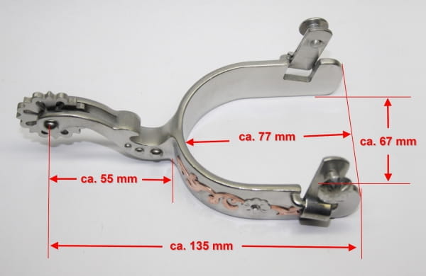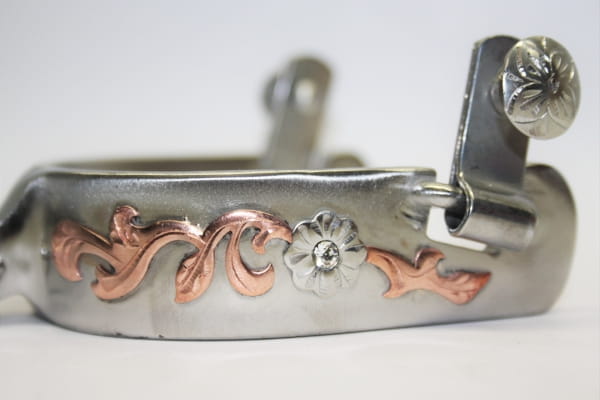 Die Josiane Gauthier Medium Ladys Spurs with Crystal Stones sind hochwertige Westernspornen aus gebürstetem Edelstahl. Diese Sporen verfügen über eine schöne Verzierung an den Sporenschenkeln und sind mit clear Stones in der Blumenverzierung versehen. Ein zusätzliches Set aus pinkfarbenen und klaren Kristallsteinen ist ebenfalls enthalten, um den Sporn individuell zu gestalten. Das Rädchen lässt sich leicht mittels Splinte und Achsen tauschen und ist in seiner Optik ein absoluter Hingucker.