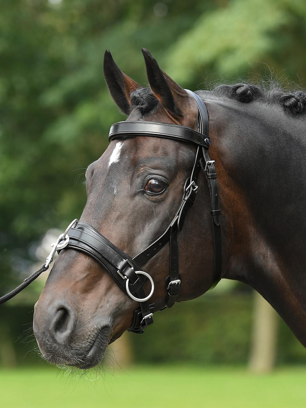 Ein schöner Kappzaum ohne Naseneisen. Er ist weich unterlegt und trotzdem stabil. Der Kappzaum hat auf dem Nasenstück einen mittigen Ring für die Longe/Führleine und seitlich zwei extra große Ringe, die zusätzlich einfach auswechselbar sind. Nasenumfang, Backenstücke und Kehlriemen sind zweiseitig sowie der Ganaschenriemen einseitig einstellbar. So kannst du den Kappzaum optimal an den Pferdekopf anpassen. Alle Schnallen sind mit Leder unterlegt, die Schnallen selbst sind mit Rollen ausgestattet und dadurch leicht zu bedienen. Der Kappzaum wird mit zwei Gebissriemen verschickt, die mitteils Chicagoschrauben individuell in der Höhe an das Backenstück befestigt werden können.