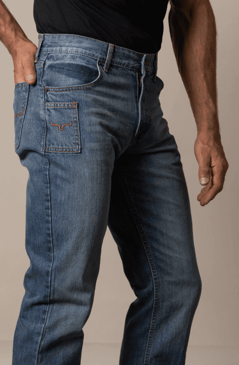 Auf dem Bild siehst du den markanten, kantigen Stil, der diese Jeans zur perfekten Wahl für Jeansliebhaber mit Anspruch macht. Die aufgesetzten Taschen mit gesticktem Kimes-Ranch-Logo runden den Look ab.