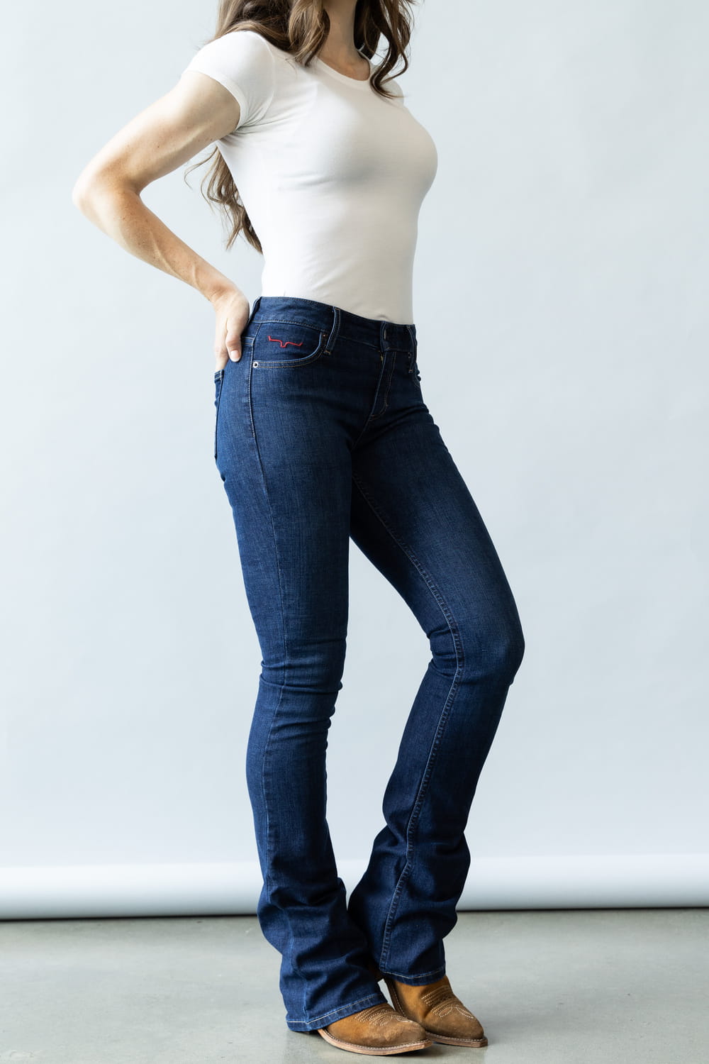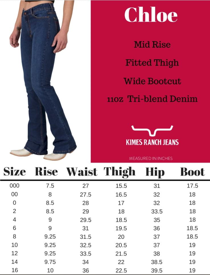 Der beliebte mittelhoher Bund der Kimes Ranch Jeans trifft bei der Chloe auf einen taillierten Oberschenkel und einen dezent ausgestellten Bootcut Bein. Der Tri-Blend-Denim in dunkler Waschung verfügt über handgeschliffene Details und ein burgunderrotes Logo auf einer einzelnen Gesäßtasche.