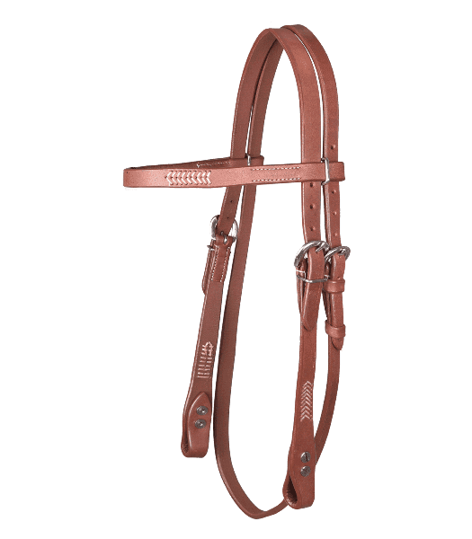 Ein tolles Stirnband-Westernkopfstück mit 2 verschiedenen Lederfarben, die prima harmonieren. Abgerundet wird der Look dieses Browband Westernkopfstücks mit einem tollen Arrow Muster aus Rawhide an den Backenstücken und dem Stirnriemen. Der Gebissverschluss erfolgt über ein Lederbändchen, ganz ohne Chicagoschrauben.