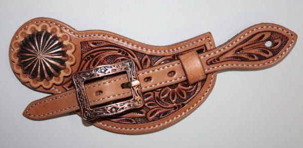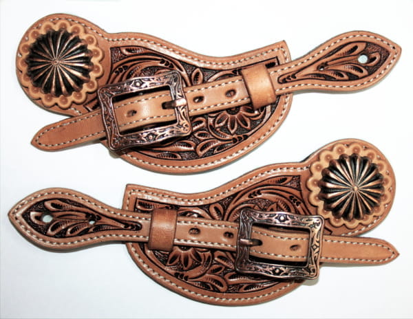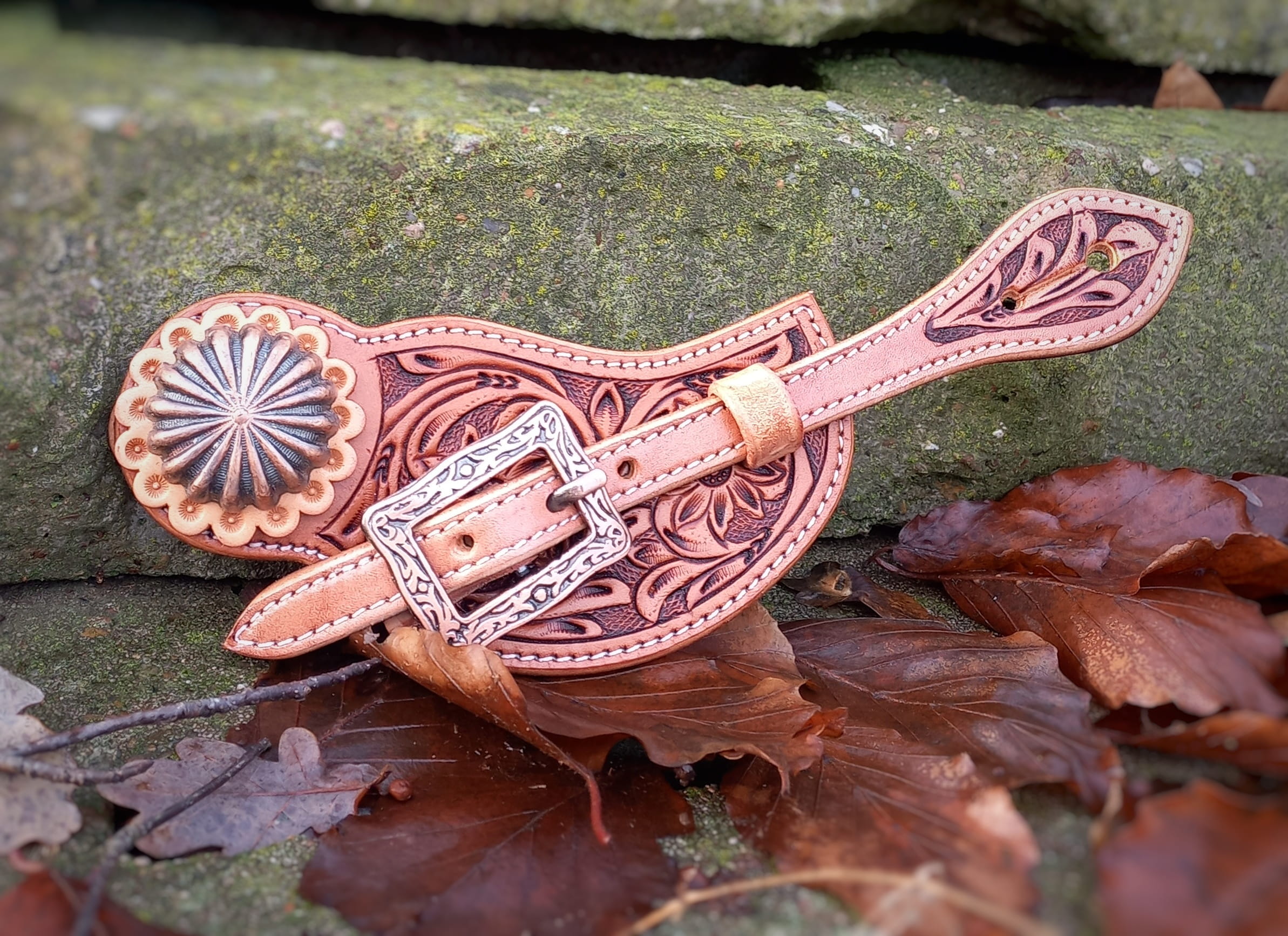 Schöner Sporenriemen für Damen in der Farbe light/russet mit tollem Flower Muster und Kupferschnalle. Das Leder dieser Sporenriemen ist lackiert und mit braunem Leder unterlegt. Die Schnallen lassen sich mittels Chicagoschrauben nach belieben tauschen. In der mittleren Einstellung hat dieser Sporenriemen ca 20cm von Sporenloch zu Sporenloch. Er lässt sich aber noch etwas verstellen.