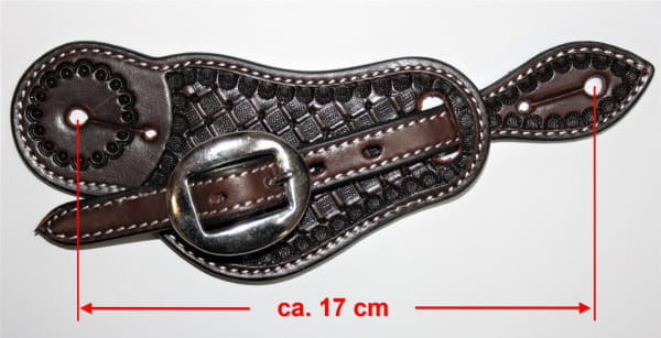 Schicker dunkelbrauner Sporenriemen für Damen mit hübscher Punzierung. Die Schnalle dieses Sporenriemen ist schlicht Silber und das Leder dieser Sporenriemen ist dunkelbraun lackiert. Die Schnallen lassen sich mittels Chicagoschrauben nach belieben tauschen. In der mittleren Einstellung hat dieser Sporenriemen ca 17cm von Sporenloch zu Sporenloch. Er lässt sich aber noch etwas verstellen.