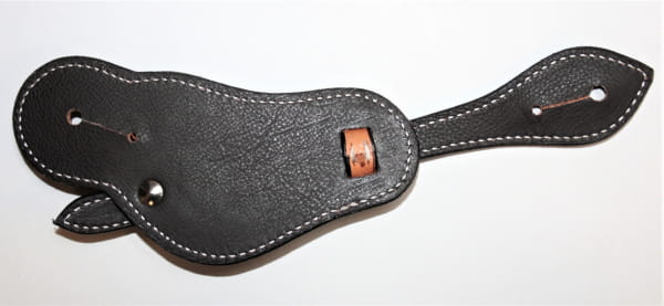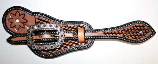 Hübscher zweifarbiger Sporenriemen für Damen mit Airflowpunzierung. Die Schnalle dieses Sporenriemen ist silber in sehr schicker Optik. Das Leder dieser Sporenriemen hell lackiert und hat außen einen dunkelbraunen Rand. Die Schnallen lassen sich mittels Chicagoschrauben nach belieben tauschen. In der mittleren Einstellung hat dieser Sporenriemen ca 20cm von Sporenloch zu Sporenloch. Er lässt sich aber noch etwas verstellen.