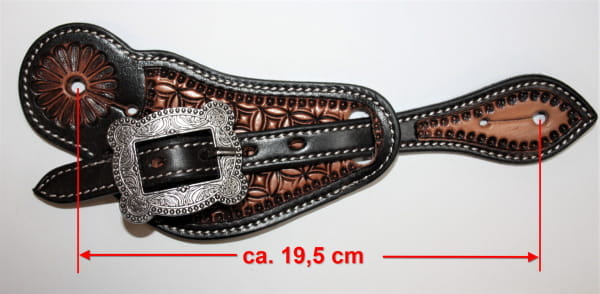 Schöner Sporenriemen für Damen in der Farbe dark brown/chestnut mit tollem mediterranen Muster und schicker Schnalle. Das Leder dieser Sporenriemen ist lackiert und mit braunem Leder unterlegt. Die Schnallen lassen sich mittels Chicagoschrauben nach belieben tauschen. In der mittleren Einstellung hat dieser Sporenriemen ca 19,5cm von Sporenloch zu Sporenloch. Er lässt sich aber noch etwas verstellen.