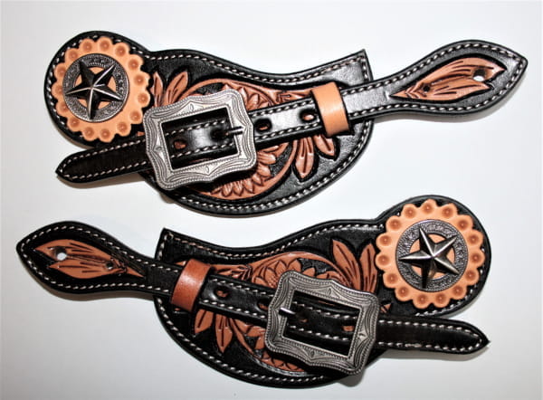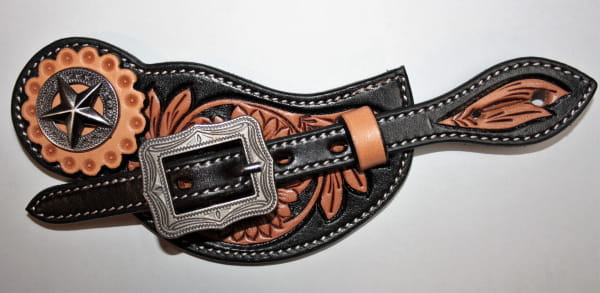 Schicker Sporenriemen für Damen in der Farbe dunkelbraun/chestnur mit tollem Flower Muster und Concho mit Stern. Das Leder dieser Sporenriemen ist lackiert und mit braunem Leder unterlegt. Die Schnallen lassen sich mittels Chicagoschrauben nach belieben tauschen. In der mittleren Einstellung hat dieser Sporenriemen ca 20cm von Sporenloch zu Sporenloch. Er lässt sich aber noch etwas verstellen.
