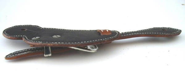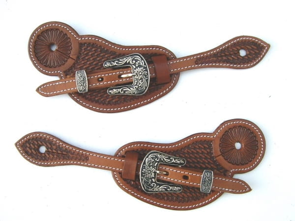 Toller Sporenriemen für Damen in der Farbe chestnut mit basket Muster. Die Schnalle im Flower Muster in silber/schwarz. Das Leder dieser Sporenriemen ist super weich und mit braunem Leder unterlegt. Die Schnallen lassen sich mittels Chicagoschrauben nach belieben tauschen. In der mittleren Einstellung hat dieser Sporenriemen ca 20cm von Sporenloch zu Sporenloch. Er lässt sich aber noch etwas verstellen.