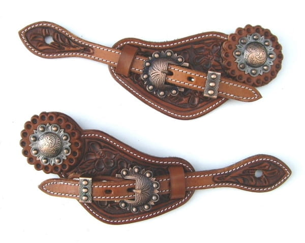 Schicker Sporenriemen für Damen in der Farbe chestnut mit Flower Muster. Die Schnalle ist schick in Copper Optik. Das Leder dieser Sporenriemen ist super weich und mit braunem Leder unterlegt. Die Schnallen lassen sich mittels Chicagoschrauben nach belieben tauschen. In der mittleren Einstellung hat dieser Sporenriemen ca 20cm von Sporenloch zu Sporenloch. Er lässt sich aber noch etwas verstellen.