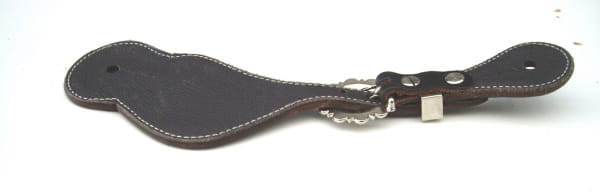 Wunderschöner Sporenriemen für Damen in der Farbe dark brown mit schicken Dots und Silberschnalle. Das Leder dieser Sporenriemen ist super weich und mit braunem Leder unterlegt. Die Schnallen lassen sich mittels Chicagoschrauben nach belieben tauschen. In der mittleren Einstellung hat dieser Sporenriemen ca 22cm von Sporenloch zu Sporenloch. Er lässt sich aber noch etwas verstellen.