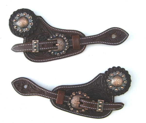 Toller Sporenriemen für Damen in der Farbe dark chestnut mit Sopper Concho und Copper Schnalle. Das Leder dieser Sporenriemen ist super weich und mit braunem Leder unterlegt. Die Schnallen lassen sich mittels Chicagoschrauben nach belieben tauschen. In der mittleren Einstellung hat dieser Sporenriemen ca 20cm von Sporenloch zu Sporenloch. Er lässt sich aber noch etwas verstellen.