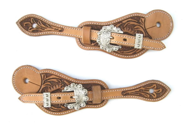 Schöner Sporenriemen für Damen in der Farbe light/russet mit tollem Flower Muster und Silberschnalle. Das Leder dieser Sporenriemen ist super weich und mit braunem Leder unterlegt. Die Schnallen lassen sich mittels Chicagoschrauben nach belieben tauschen. In der mittleren Einstellung hat dieser Sporenriemen ca 20cm von Sporenloch zu Sporenloch. Er lässt sich aber noch etwas verstellen.