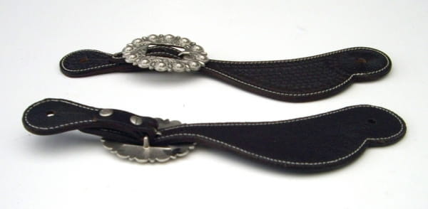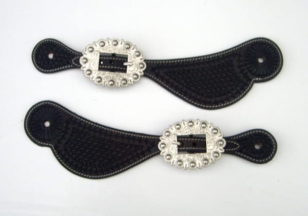 Dunkel brauner Sporenriemen für Damen mit Basketpunzierung. Die Schnalle dieses Sporenriemen ist schlicht Silber ohne Steinchen und Co. Das Leder dieser Sporenriemen ist super weich und mit schwarzem Leder unterlegt. Die Schnallen lassen sich mittels Chicagoschrauben nach belieben tauschen. In der mittleren Einstellung hat dieser Sporenriemen ca 24cm von Sporenloch zu Sporenloch. Er lässt sich aber noch etwas verstellen.