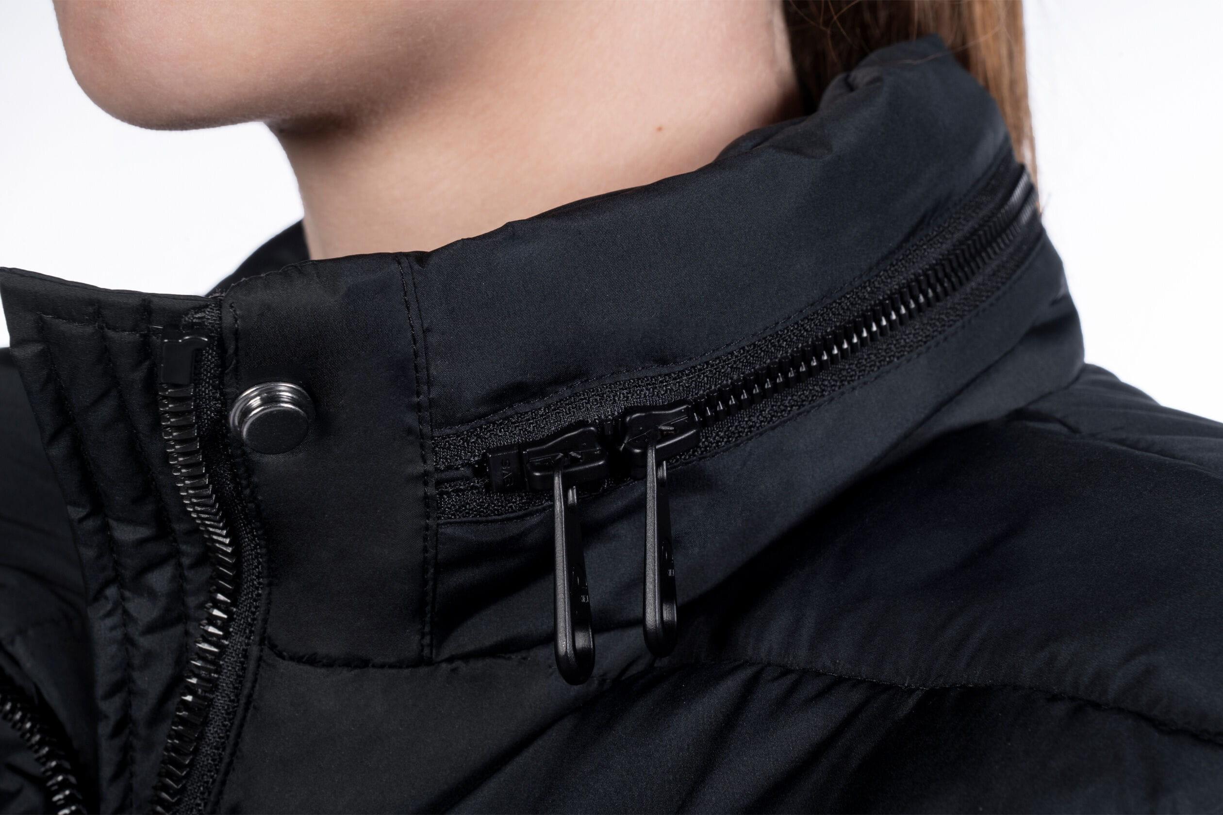 Die Langweste – Misty ist wasserabweisend und wattiert, mit modischer Steppung und einem Stehkragen, der innen mit warmem Fleece gefüttert ist. Der Reißverschluss am Kragen verbirgt eine praktische, versteckte Kapuze. Für flexiblen Komfort sorgt ein Zwei-Wege-Reißverschluss mit Blende vorne. Große Reißverschlusstaschen, die von oben und unten geöffnet werden können, sind zusätzlich mit warmem Innenfutter ausgestattet. Die rechte Tasche besitzt einen elastischen Haken zum sicheren Befestigen von Schlüsseln oder Kleinteilen. Lange Reitschlitze in den Seitennähten ermöglichen optimale Bewegungsfreiheit und sind mit reflektierendem Innenprint versehen – ideal für warme, trockene Stunden im Sattel.