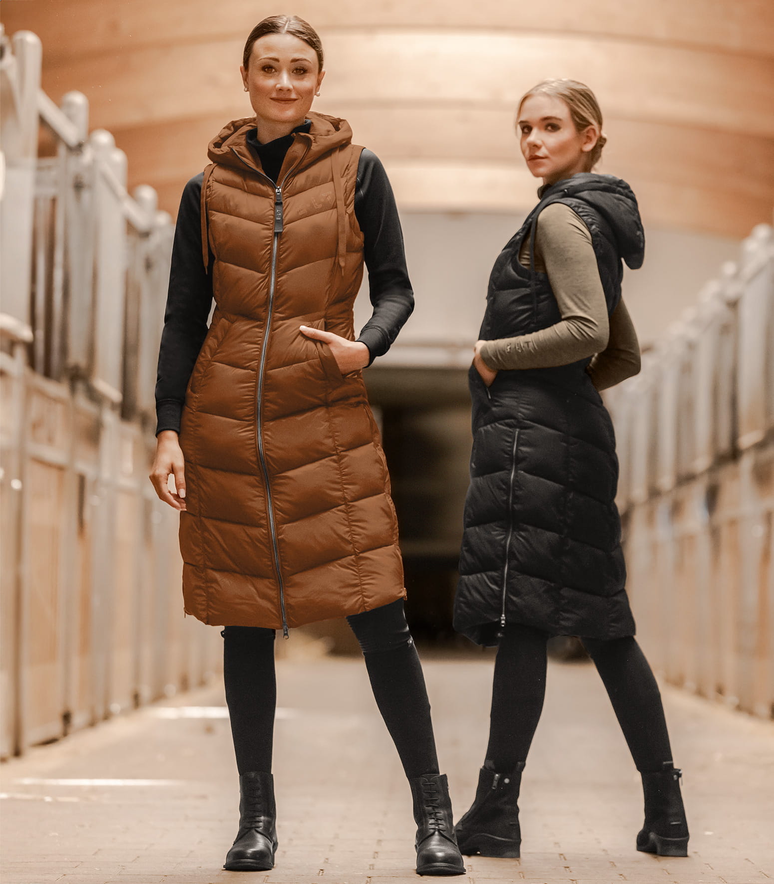 Diese lange Steppweste ist die ideale Begleiterin für kühlere Tage – leicht und trotzdem wunderbar wärmend dank ihrer daunenartigen Füllung. Die taillierte Passform und das leicht glänzende Material sorgen für eine stilvolle Optik. Die Weste ist windabweisend und bietet zusätzlichen Schutz durch eine im Kragen integrierte Kapuze, die am Rücken fixiert werden kann und mit einem Tunnelzug sowie einem dekorativen Stricktape versehen ist. Ein hochwertiger 2-Wege-Reißverschluss in Metalloptik mit Kinnschutz sowie seitliche Reißverschlusstaschen mit Metallpullern bieten Funktionalität und Stil. Seitliche Reitschlitze und eine durchgesteppte Innenverarbeitung mit gepaspelten Nähten unterstreichen die hochwertige Verarbeitung. Der E·L·T Schriftzug auf der Vorderseite verleiht der Weste den letzten Schliff. Material: Obermaterial und Futter aus 100% Polyamid, Wattierung aus 100% Polyester.